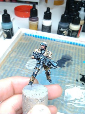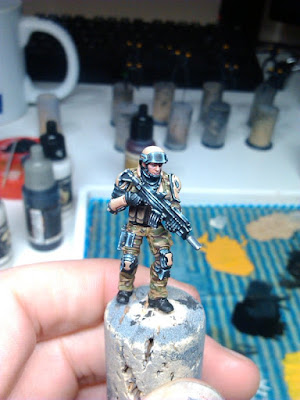 What can I say about these minis that they don't already say about themselves. The camouflage pattern is super impressive on it's own, but the reflections on the black armor and weapons are what put it over the top. Everything is smooth and crisp and incredibly insane when you consider how tiny Infinity models are. These are another great example of minis that could easily be used as box art by the company that produces them. They are painted in such a realistic manner, with such realistic color choices, that I wouldn't have known these were even sci-fi models if I didn't double check. They almost look like they would be right at home fighting in the armed forces of today. Great job on these KujoPainting!